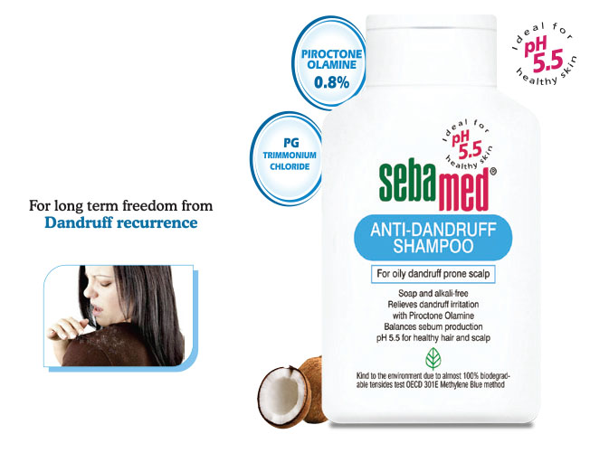 Dandruff prone scalp requires extra care. Always use a gentle anti-dandruff shampoo, which is sulfatefree/ paraben-free/ soap-free/ alkali-free (with a conditioner) formulated especially for dandruff prone hair. Using alkaline shampoos often damage the scalp further and lead to dandruff recurrence. Hence look for a gentle shampoo with pH 5.5 and an anti-dandruff agent, which protects the scalp from damage, relieves dandruff irritation, balances sebum production, thereby preventing dandruff recurrence. The fungal growth is also minimum at pH 5.5