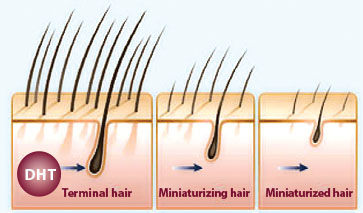 Male pattern hair loss can be caused by a combination of genetic and hormonal factors. A hormone called dihydrotestosterone (DHT) (produced locally at the site of hair roots) causes a change in the hair roots on the scalp. The hair produced by the affected follicles become progressively smaller in diameter, shorter in length and lighter in color until eventually the follicles shrink completely and stop producing hair.5 Other causes include family history, medications like steroids, thyroid conditions.